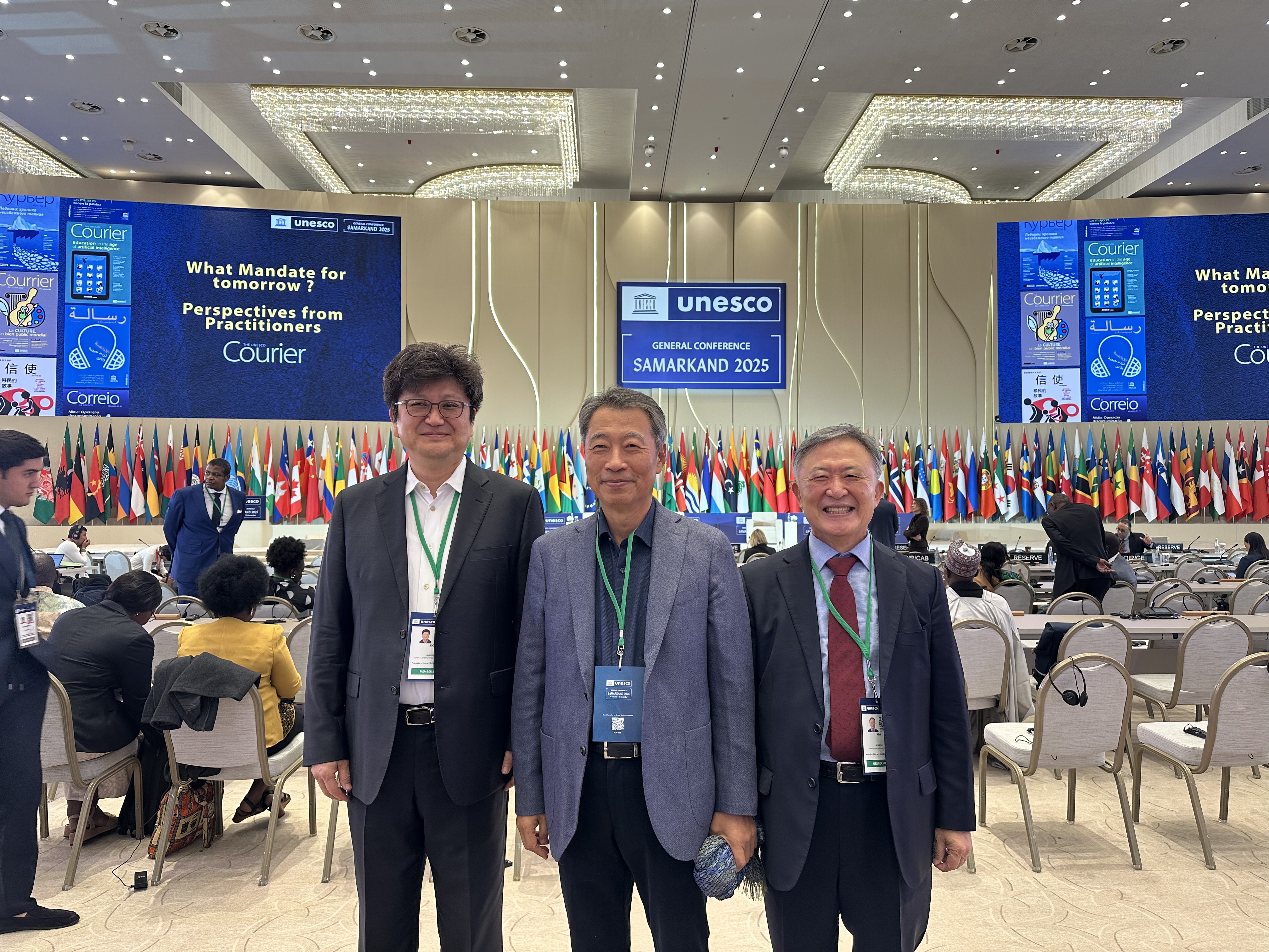 김성열 부위원장 (이하 김) 사마르칸트는 우즈베키스탄에서 두 번째로 큰 도시이자 오랜 역사를 가진 고도(古都)로, 동서양 문명이 만나는 교역의 중심지였지요. 우리나라로 치면 경주 같은 분위기가 물씬 났는데요. 총회가 열린 의회 센터(Congress Center)를 둘러보면 우즈베키스탄이 이번 행사를 계기로 이곳을 중앙아시아 지역의 국제회의 중심지로 만들려는 계획을 세운 듯 보였어요. 타슈켄트 공항에 도착한 후 사마르칸트로 이동하는 과정에서 만난 자원봉사자들과의 짧은 대화에서도 그것을 느낄 수 있었습니다. 정종섭 분과위원장 (이하 정) 사마르칸트는 과거 문명들이 수많은 부침을 겪으면서 서로의 삶을 교류하며 새로운 길을 개척해온 도시였잖아요. 그런 점에서 이번 장소 선정은 유네스코가 문화를 바탕에 둔 평화롭고 조화로운 미래에 대한 의지를 다시 우리에게 일깨워 주고 있다고도 느꼈습니다. |