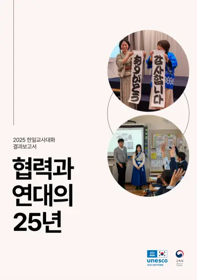 유네스코한국위원회는 한·일 양국 교사 간 교육 교류의 25년 성과를 담은 2025 한일교사대화 결과보고서를 발간했습니다. 이 보고서는 ‘협력과 연대의 25년’이라는 비전 아래 교직원 상호 초청 연수와 현장 실천 사례, 대화의 성과를 정리하여 양국 교육현장의 상호 이해와 지속가능한 협력 방향을 제시합니다. |