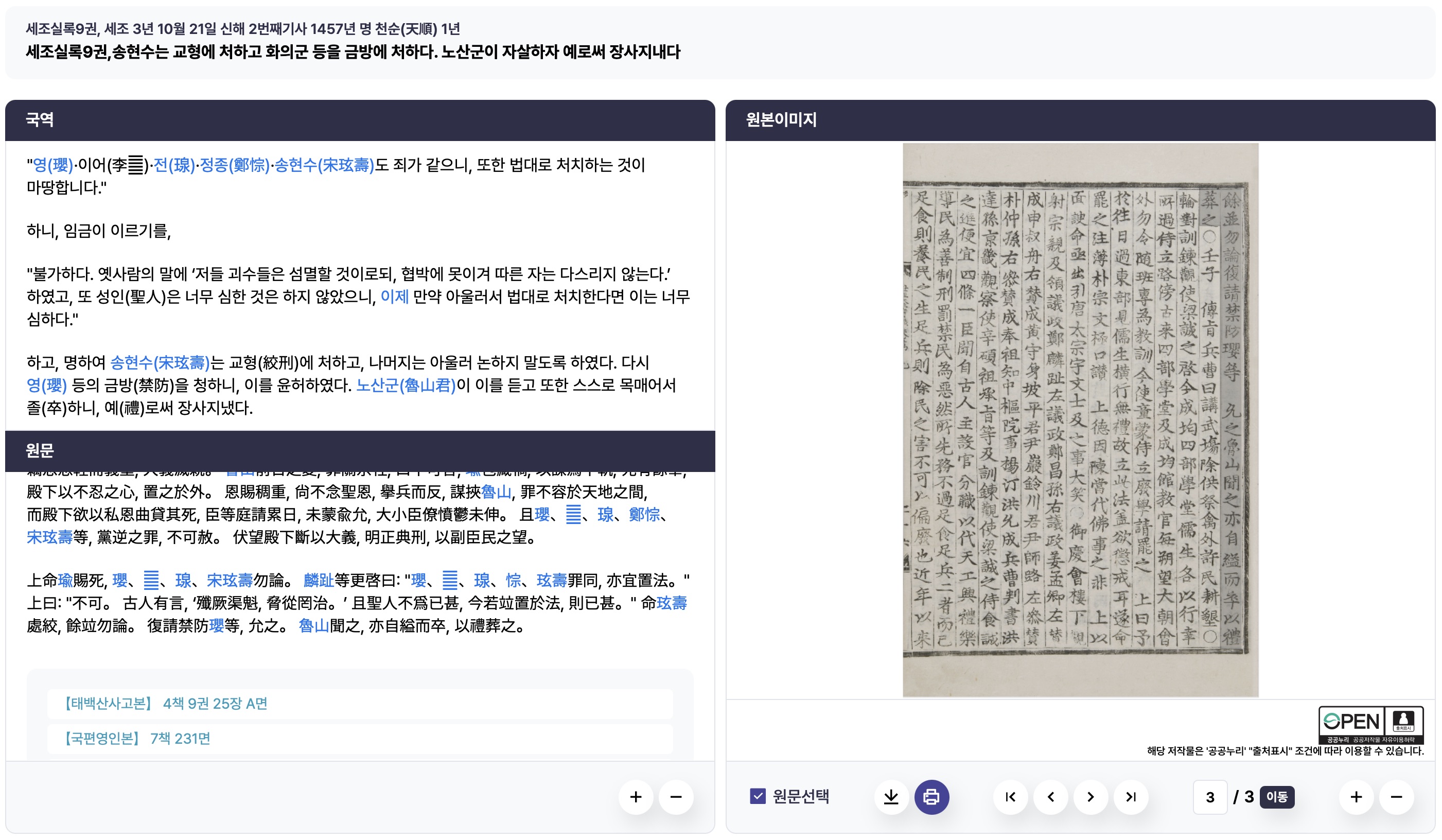 잘 보존된 기록유산의 의미와 활용 가치 여러분, 혹시 ‘왕사남’ 보셨나요? 영화 《왕과 사는 남자》가 무려 천만 관객을 넘어 여전히 극장에서 인기를 끌고 있는데요. 역사적 인물을 다룬 콘텐츠가 주목받을 때 종종 그렇듯, 영화 흥행과 함께 단종의 생애를 둘러싼 역사적 사실에 대한 관심도 새삼 높아지고 있는 것 같습니다. 단종의 유배 생활과 죽음, 그리고 그를 도왔던 엄흥도라는 인물의 이야기는 역사적 기록 속에서 어떻게 그려지고 있을까요? 유네스코 뉴스레터도 그 부분이 궁금해서 우리가 자랑하는 세계기록유산인 조선왕조실록(朝鮮王朝實錄, 1997년 등재)을 찾아봤습니다. 실록의 방대한 내용이 모두 디지털화되어 한글 국역까지 함께 제공하고 있는 덕분에 그 내용을 찾는 과정은 어렵지 않고 재미있기까지 했어요. 몇 번의 검색으로 손쉽게 되살아난 그 시절 두 사람의 기록. 그 속으로 여러분을 안내합니다. |